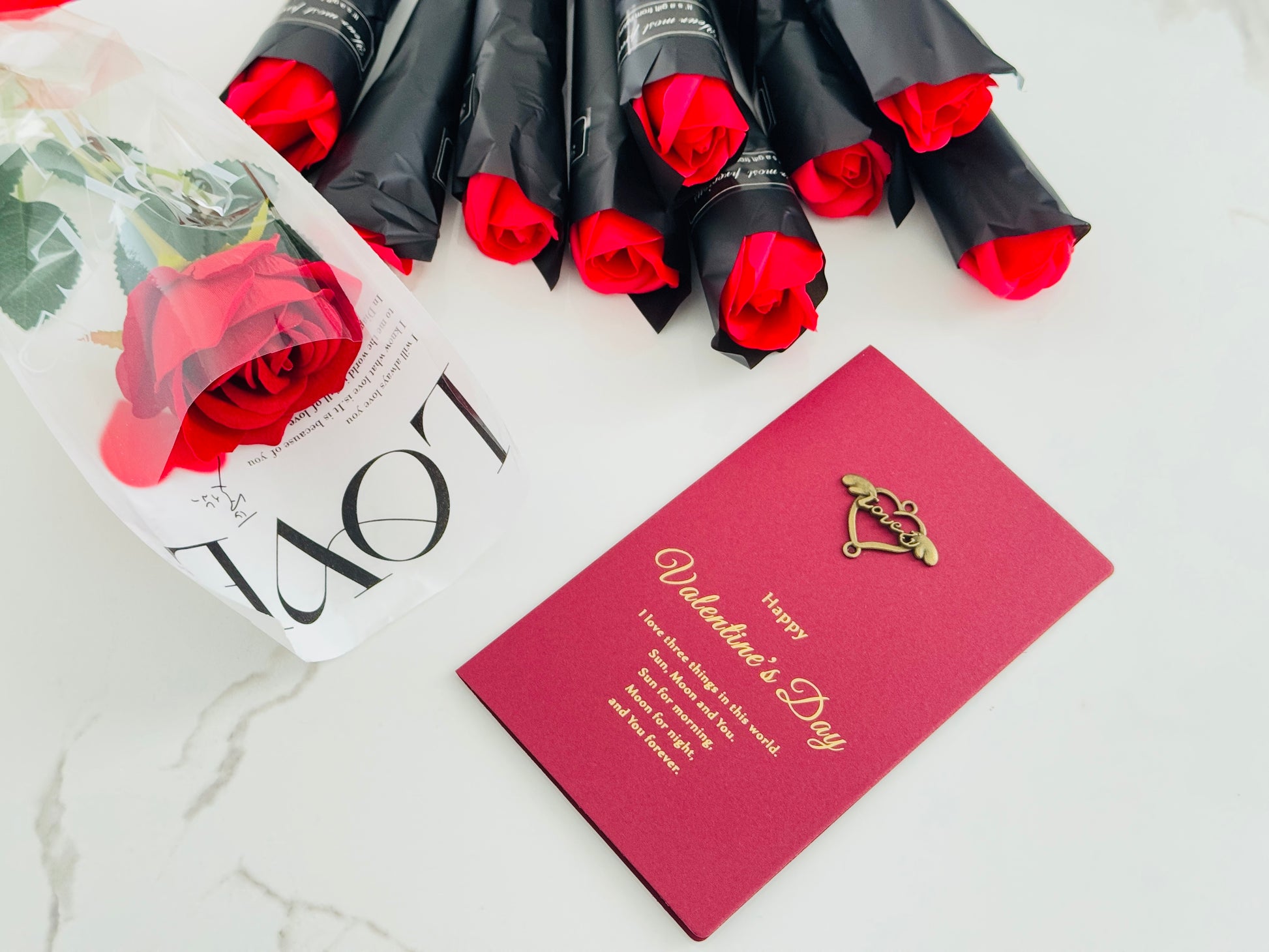 Each gift card comes in rich luxury colors with a beautiful symbol attached on the front. The red rose is carefully wrapped for a classy and romantic look, making your gift feel complete and special.