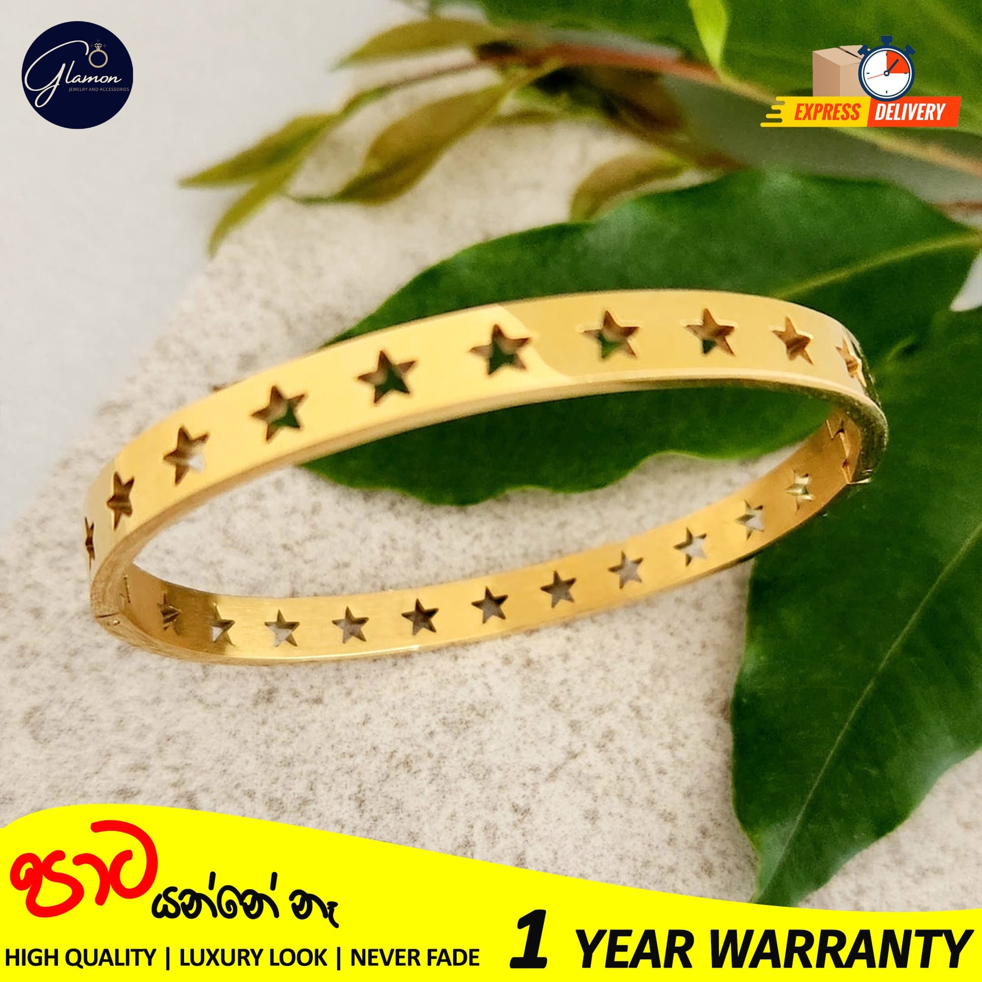 ❖නෙත් සිත් ඇදගන්නා පෙනුම : Glamon දිදුලන සහ වර්නය වෙනස් නොවන තරු bangle එක ඔබගේ ස්වර්ණාභරණ එකතුවට අලංකාර සහ සැලකිය යුතු එකතු කිරීමකි. වටිනා පොහොසත් පෙනුමක් ඇති gold bangle එක ඕනෑම අවස්ථාවක ඕනෑම ඇදුම් විලාසිතාවක් සමග ඔබේ පෙනුම සම්පූර්ණ කරයි, එය ඔබේ පෙනුමට දීප්තියක්ද එක් කරයි.