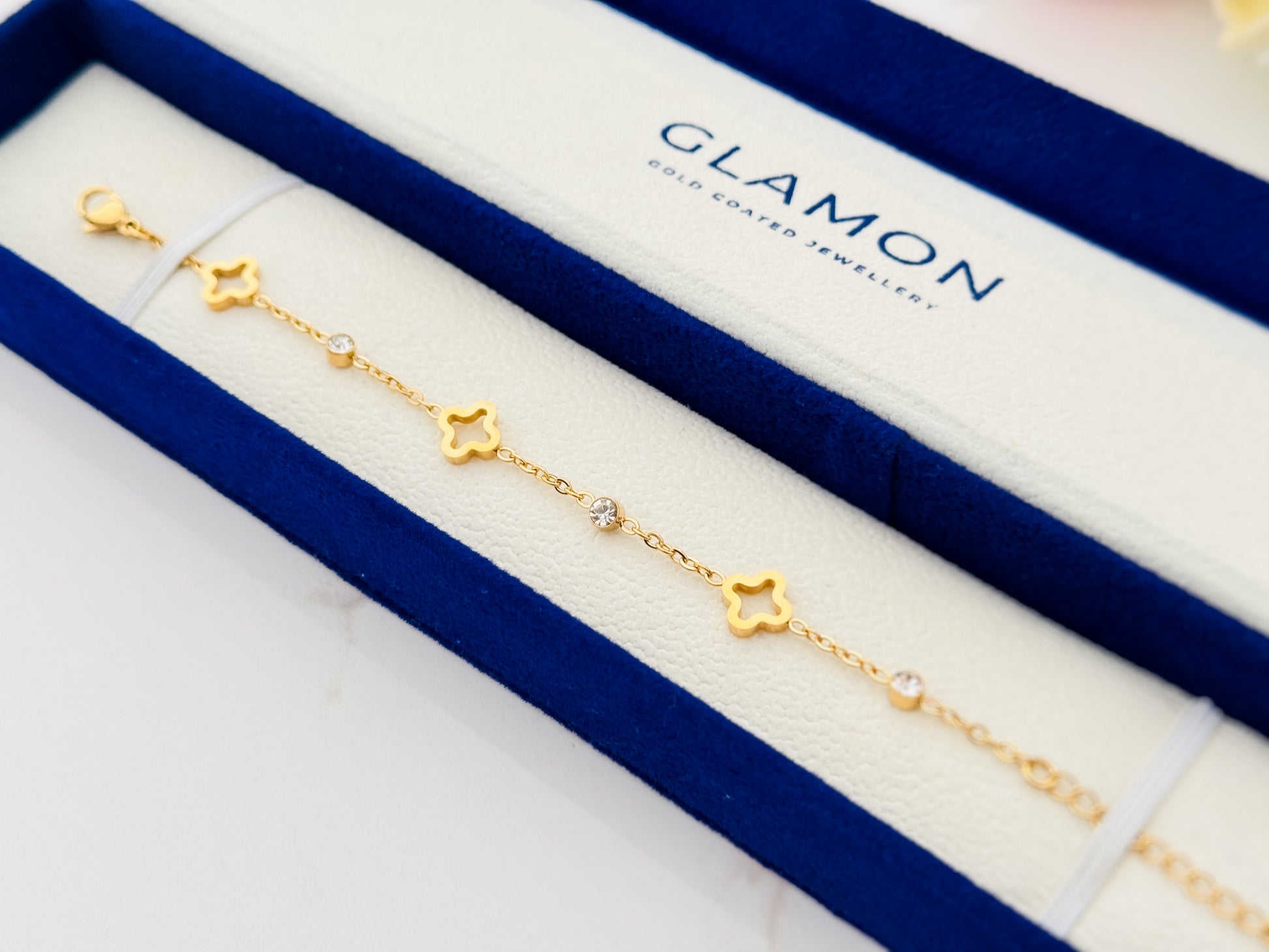 The Glamon Golden Clover Bracelet is a delicate and elegant bracelet designed for girls who love timeless luxury. Crafted with a high-quality stainless steel base and finished with long-lasting gold coating, this bracelet offers beauty, durability, and everyday comfort.